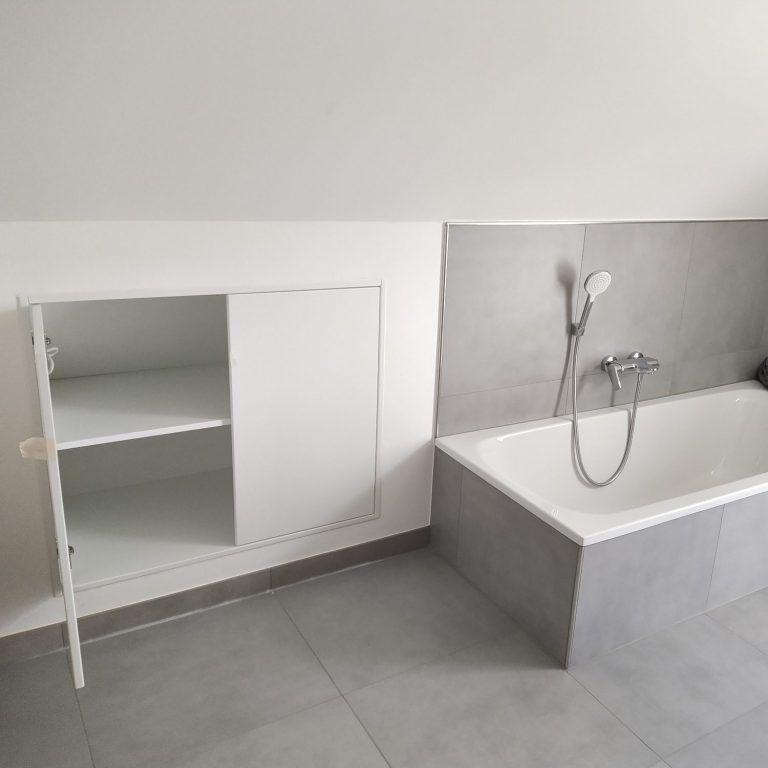 Integrierter Einbauschrank passgenau in die Abseite der Wand gefertigt, mit weiß lackierter Oberfläche.