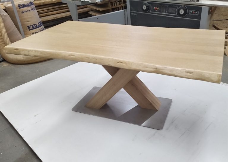 Eiche Vollholztischplatte mit natürlicher Baumkante, gebürsteter und lackierter Oberfläche. X-Gestell aus massiver Eiche mit sonderangefertigter Edelstahlplatte.